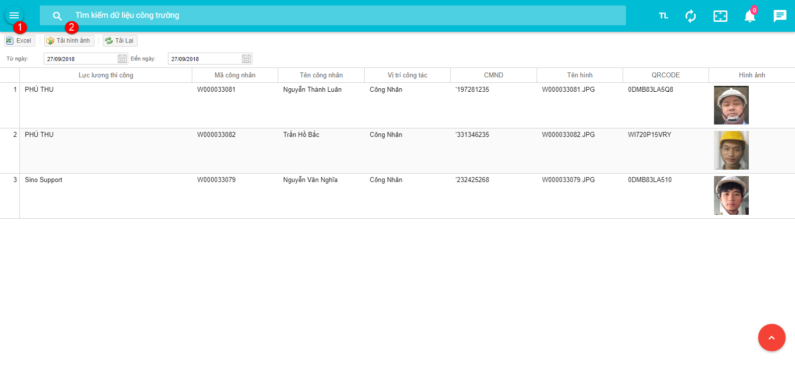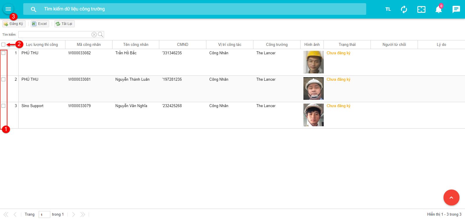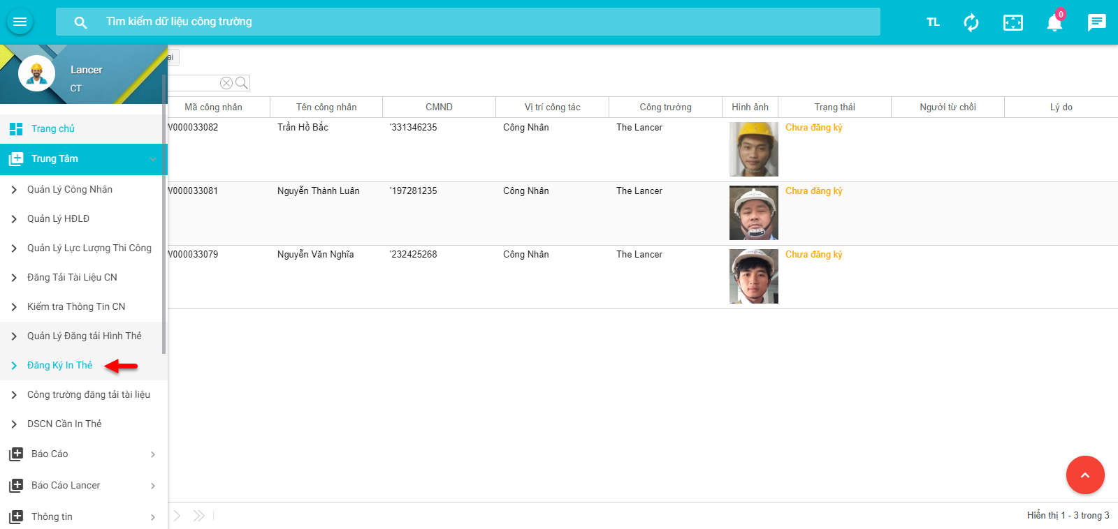 Trang đăng ký in thẻ: Danh sách tất cả CN thuộc công trường đã có đầy đủ thông tin và hình thẻ nhưng chưa được cấp thẻ.