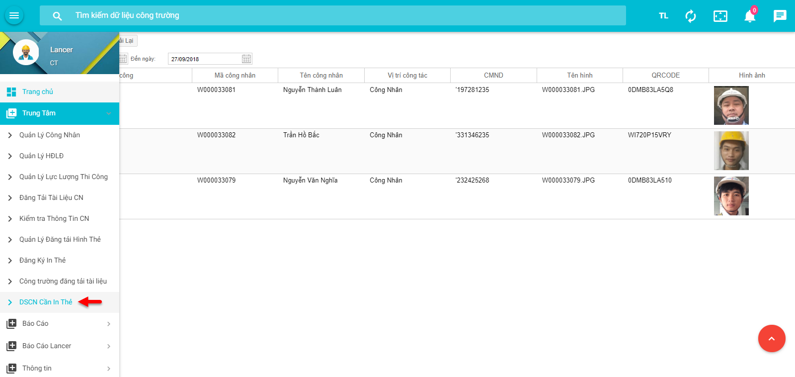 Sau khi đã được duyệt, chọn menu như bên dưới để vào trang DSCN cần in thẻ, đây là trang hiển thị danh sách CN đã được duyệt đăng ký in thẻ.
